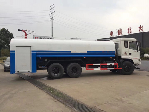 保定用戶購置15噸東風T5保溫運水車帶灑水車發車,該車夏季用戶綠化噴灑使用,而且駕駛室前置電動灑水炮,冬季用來運輸熱水,一車多功能。