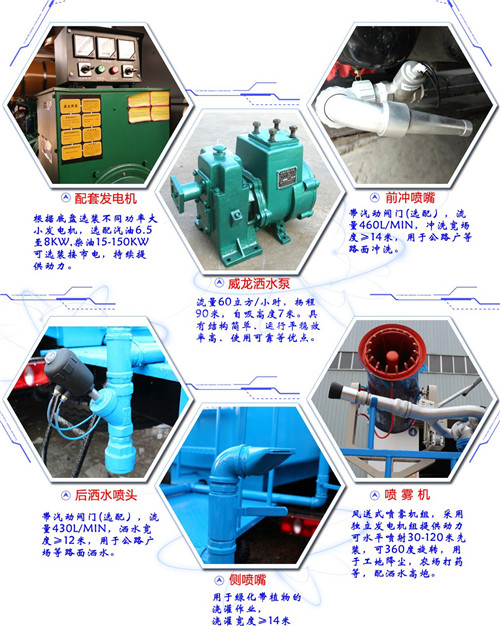 改裝配置:罐體用4MM碳鋼板制作,罐內隔板具有防波作用,以減低汽車行駛時罐體液體的沖擊。整車帶一個專用灑水泵(垂直最大吸程6米),灑水寬度14米,射程28米。多功能灑水車配備2個前沖(噴)(能將路面泥巴、塵土、垃圾沖干凈);2個后灑(能均勻地將水灑在路面,一次灑水寬度14米)、2個側噴(花灑)(能均勻地將路旁綠化帶澆灌)、帶1個后工作平臺,平臺上安裝1個綠化灑水高炮(灑水炮可全方位旋轉,可連續調成直沖狀、大雨、小雨、毛毛雨,霧狀可調節沖洗高大樹木),引水時間<5min,流量90m3/h。帶1個消防接頭,帶1個自流閥,1個過濾裝置、人性化爬梯及側防護欄,安裝灑水音樂喇叭。