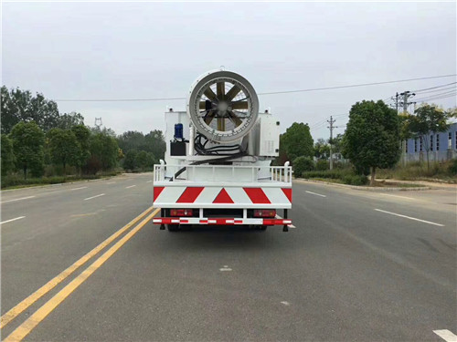 東風12噸灑水車選配50米噴霧機達到除塵效果。霧炮機是根據風送原理,先使用進口高壓泵、微細霧化噴嘴將水霧化,再利用風機風量和風壓將霧化后的水霧送到較遠距離,使得水霧到達較遠距離同時能夠覆蓋更大面積,水霧與粉塵凝結后降落,從而達到降塵目的。