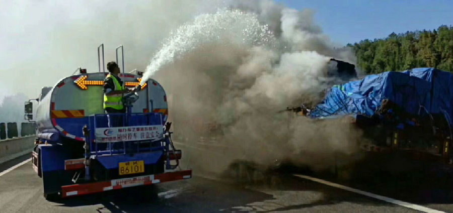事情是這樣的,南昌的劉老板正在江西某告訴路上進行樹木養護灌溉,(大家肯會問南昌的劉老板咋跑江西告訴上養護樹木了,那是應為南昌的劉老板進行招標,贏得了江西某告訴路段的養護)今天剛好在告訴路上進行樹木養護,看見前方路段冒起了濃煙滾滾的,根據劉老板多年的經驗,一看就知道前方發生了火災,這位劉老板不管是森林火災還是車輛火災,都要前去滅火,(大家都知道火在不管的情況下,才能變成火災,只要把火在剛開始燃燒的時候給滅掉就不會發生火災)這劉老板一過去就看見一輛半掛車在燃燒,這是的火還不是非常大,還是非常危險的,這劉老板不更具自己多年的經驗判定火勢自己的灑水車能把火給滅了,上去就加大馬力,利用灑水車水炮進行滅火,經過半小時火勢給控制住了,只剩濃煙,劉老板這不能松懈一定要等消防隊來啦交給消防隊才能放心,就在旁邊進行霧狀噴水,(大家都知道灑水車水炮是有兩種用途的,一種是水柱狀,這書水炮在水柱狀時是能消防滅火的,射程能達到35米,大家也要注意沖擊力大有危險,不要對準人只用。二是霧狀,灑水車水炮霧狀時能降低空氣里面的粉塵,是分解濃霧的最得力的幫手。)