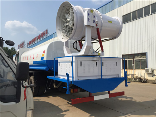 目前最受房地產歡迎的多功能抑塵車為噴霧灑水車,該車除了常規的抑塵車的配置以外,還加裝了一套噴霧系統,噴霧系統主要由電機,電泵和噴灑總成組成,最大作業半徑為35米,可以遙控電控,噴霧系統可以旋轉,點頭工作。噴霧系統最大電機功率高達5.5千瓦,水泵點功率6千瓦,風機攜帶18個噴霧頭,噴霧頭可更換。