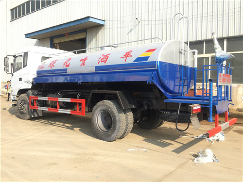上裝配置:罐體采用4mm厚武鋼產(chǎn)專用容積板制作,罐體容積12立方米,罐體內(nèi)采用先進(jìn)的對(duì)接焊技術(shù),罐體焊后采用噴丸漏檢測(cè),使罐體具有強(qiáng)度高、重心穩(wěn),灑水車運(yùn)載安全平衡等特點(diǎn)。配備全國(guó)質(zhì)量評(píng)比第一名的(日本技術(shù))大功率專用灑水泵。前(噴)后灑,帶側(cè)噴,后置工作平臺(tái),平臺(tái)上安裝綠化灑水高壓炮(炮噴射形狀可調(diào)成直沖狀、大雨、中雨、毛毛雨、炮可360度旋轉(zhuǎn),射程>35米)。帶自流閥,消防接口。帶自吸泵,可將池塘的水直接吸入罐體內(nèi)也可直接從城市街道消防栓上連接注水,吸入罐體內(nèi)。灑水車也可做噴藥車使用,可根椐用戶要求進(jìn)專業(yè)噴藥防腐處理,也可做企業(yè)單位運(yùn)水用,緊急時(shí)可做消防車使用。對(duì)灑水車有特殊要求的用戶請(qǐng)?zhí)崆案嬷蔀橛脩籼峁┘友b各種附件,管道及多個(gè)噴頭。