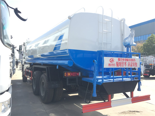 灑水車前裝有鴨嘴型噴霧或圓頭沖嘴,后面裝有圓柱形灑水砣,側噴花灑蓮花頭,車后部裝有高射噴槍。(選裝)