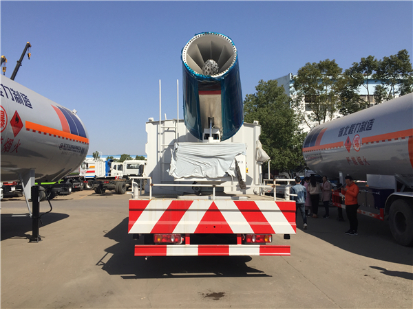 2.爆破抑塵車效率高、射程遠、覆蓋面積大、水霧且均勻、抑塵效果好。水霧與飄在空中的塵埃接觸時,被塵埃所吸附,加大塵埃的比重,抑制塵埃在空氣中的流動,并加速塵埃沉降,實現對空氣的凈化。