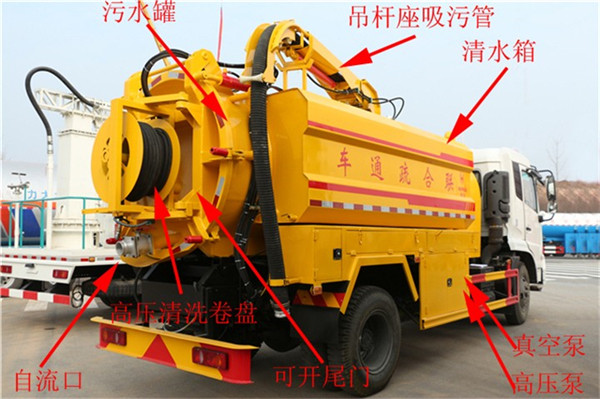 藍牌高壓清洗吸污車,車輛采用東風多利卡底盤,黃色豪華駕駛室帶空調,液壓助力離合助力,鋼絲胎,3308軸距,700鋼絲胎(帶備胎)帶ABS防抱死系統,污罐容積3.8立方(武鋼優質鋼板6個厚)水箱1.5立方(武鋼優質鋼板4個厚)配備德國品孚170L流量高壓泵,山東SK-9水循環真空泵,尾部一個100吸污口,一個100自流,尾部帶鎖緊裝置,帶水污互通,洗手裝置,其余廠家標配