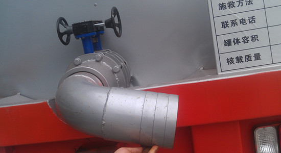 瀝青運輸車也叫液態瀝青保溫運輸車,由于液態瀝青介質比較粘稠,而且有一定的溫度要求,所以排泄大多屬于自流。一般瀝青運輸車自流裝置在車輛的尾部,采用耐高溫球閥控制。如下圖。