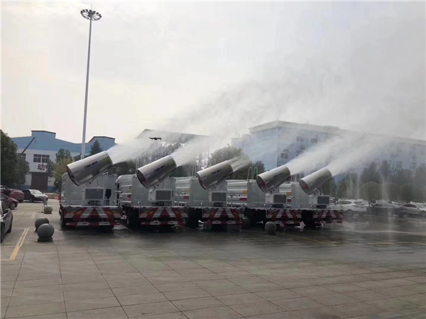 目前最受房地產歡迎的多功能抑塵車為噴霧抑塵車,該車除了常規的抑塵車的配置以外,還加裝了一套噴霧系統,噴霧系統主要由電機,電泵和噴灑總成組成,最大作業半徑為35米,可以遙控電控,噴霧系統可以旋轉,點頭工作。噴霧系統最大電機功率高達5.5千瓦,水泵點功率6千瓦,風機攜帶18個噴霧頭,噴霧頭可更換。