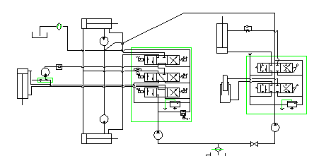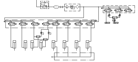 氣動系統從底盤貯氣筒取得氣源,工作壓力≮0.6Mpa。根據不同的作業要求,由電磁閥控制各個氣缸實現不同的動力組合。