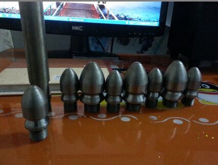 除了直噴頭以外,每個噴頭都有向后的6個噴射孔(一邊穿透、破碎、攪拌堵塞物,一邊推動噴頭和耐高壓水管前進),其中2、3、5、8號另外,還有一個前噴孔(穿刺堵塞物并作為導引孔)。