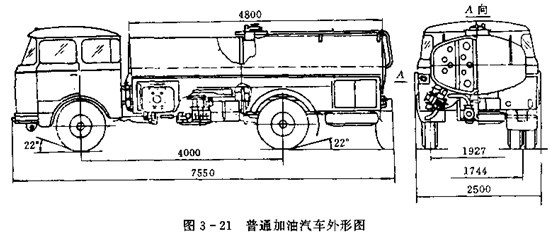 加油車通常由氣車底盤、罐體、油管、各種閥、各種工作儀表,過濾器、靜電消除裝置,軟管盤總成,加油槍及驅動裝置等組成。圖3-21為普通加油汽車外形圖。