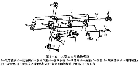 加油車為了具備給受油設備加油、自吸裝油、循環攪油,移動泵站作用,吸回加油軟管中的油液等五種功能,輸油管路也較運油汽車復雜,并設有油泵。圖3-23是一大型加油車的管路系統。該車有四個艙, 每個艙底都裝有一個底閥裝置(見圖3-24),并且為放油方便,在汽車左、右兩側及尾部各設置一個放油閥,以便適應車輛在不同方位上時進行加油作業。