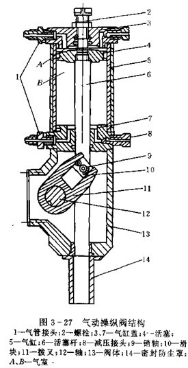 放油閥的操縱形式有手動,液動,氣動和電動等,根據總布置要求確定,手動形式簡單,在無特殊要求時,一般采用手動,為提高機械化程度,也可采用液動或氣動,液動力源可取本車動力轉向系統的壓力油液,氣壓源可取本車制去氣源。電動形式容易引起火災。圖3-27為氣動操縱閥的結構,用來操縱放油閥或其它的控制閥,當氣室A充氣,氣室B排氣時,空氣壓力推動活塞4通過活塞桿6滑塊10使拔叉11轉動,于是轉軸12使放油閥(控制閥)開啟或關閉。